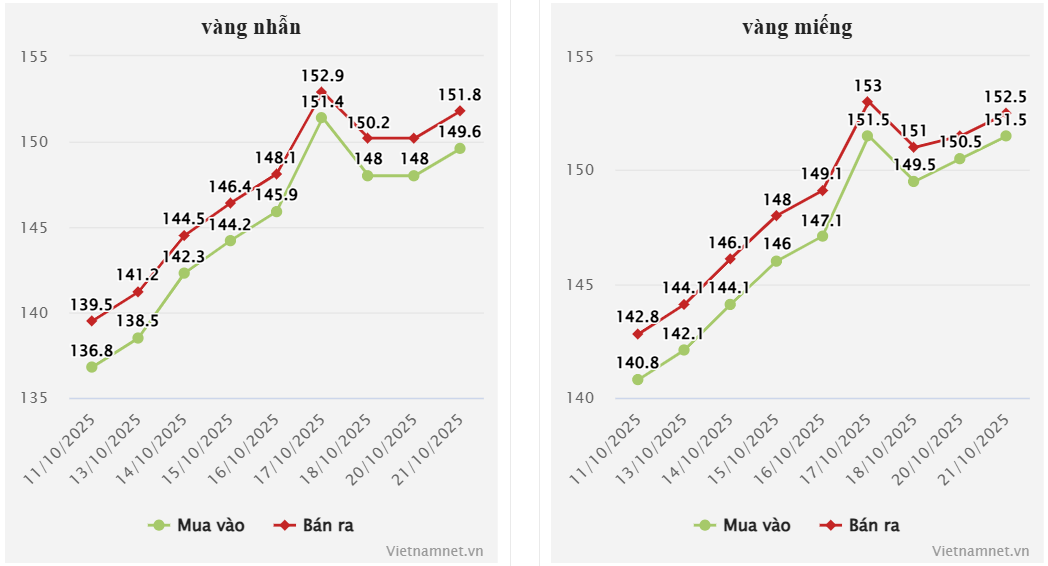 Domestic gold prices have continuously set new record highs. Specifically, by the end of the trading session on October 21, the price of 9999 gold bars at SJC was listed at 151.5-152.5 million VND/tael (buy-sell), an increase of 1 million VND compared to the previous session.