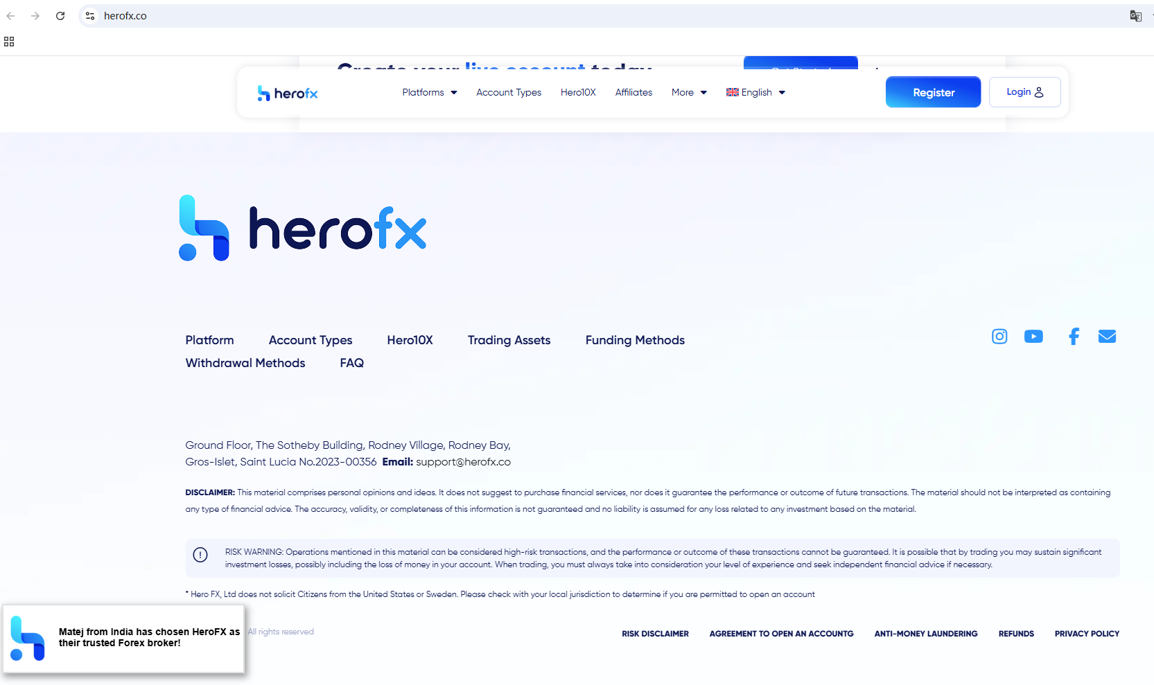 On its official website, HeroFX claims to be a reputable company. However, it provides no valid regulatory information. The broker claims to be based in Saint Lucia, a country known not to regulate forex activities.