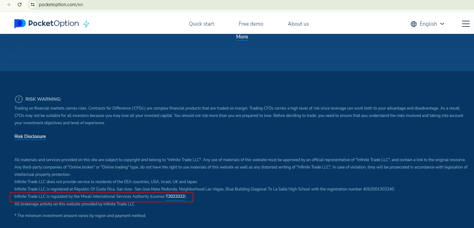 In other words, Pocket Option is not subject to any valid regulatory supervision.