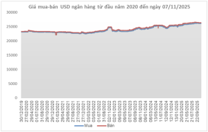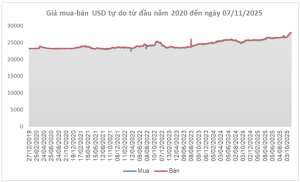 In Vietnam, the central exchange rate announced by the State Bank of Vietnam (SBV) on November 7 was 25,103 VND/USD, up 10 dong from the previous week, ending a five-week losing streak. With a trading band of ±5%, commercial banks are allowed to quote rates between 23,848 and 26,358 VND/USD.