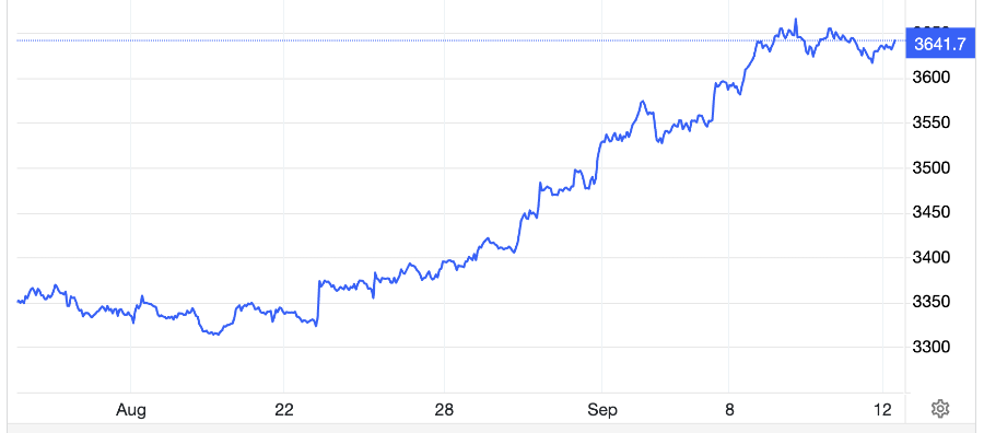 At 7:30 this morning (September 12) Vietnam time, the spot gold price in the Asian market stood at 3,633.5 USD/oz, down 1.9 USD/oz compared to the closing price last night in the US market, equivalent to a decrease of 0.05% – according to data from the Kitco exchange. Converted according to the USD selling rate at Vietcombank, this price is equivalent to about 115.9 million VND/tael, down 300,000 VND/tael compared to yesterday morning.