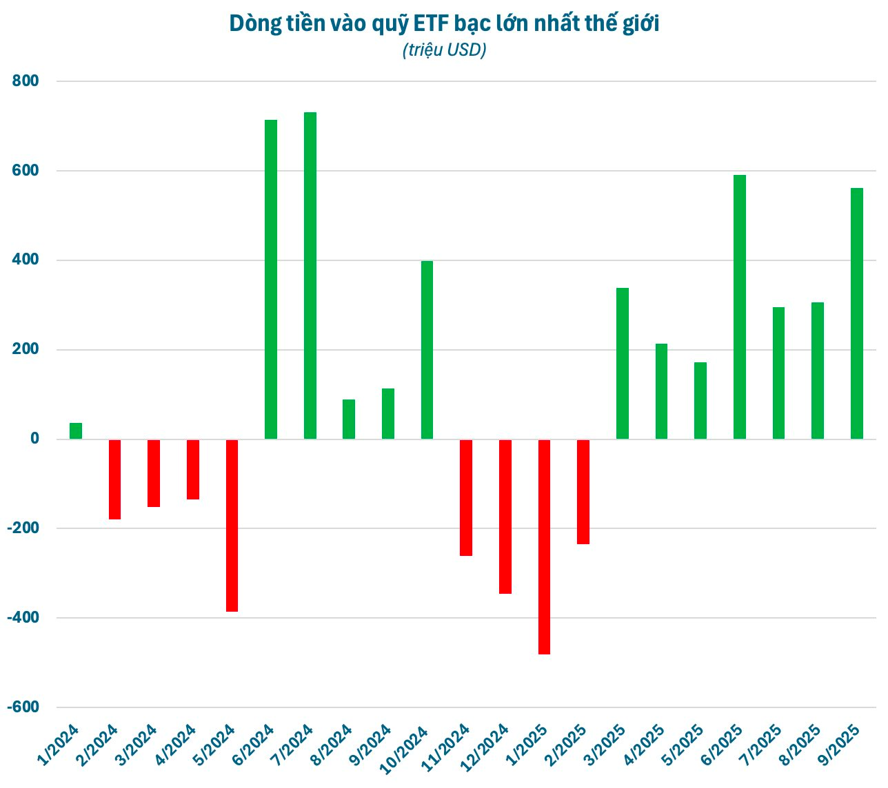 Theo số liệu mới nhất, các quỹ ETF vàng global đã mua ròng tổng cộng gần 590 tấn vàng từ đầu năm đến nay, trong khi quỹ bạc lớn nhất thế giới đã gom khoảng 1.100 tấn bạc. Trong đó, chỉ riêng tháng 9 vừa qua, các quỹ vàng đã “rót” khoảng 14 tỷ USD vào thị trường, nâng tổng giá trị rót ròng từ đầu năm lên khoảng 60 tỷ USD.