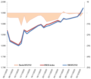 Các hợp đồng tương lai VN30 và VN100 đồng loạt tăng điểm trong phiên giao dịch ngày 03/12/2025. VN30-Index tăng điểm phiên thứ 4 liên tiếp kèm theo khối lượng liên tục gia tăng và vượt mức trung bình 20 phiên cho thấy tâm lý khá lạc quan của nhà đầu tư tiếp tục hiện hữu.
