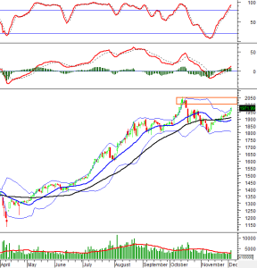 Hiện tại, chỉ số đang bám sát dải trên (Upper Band) của Bollinger Bands và đang tiến về đỉnh cũ tháng 10/2025 (tương đương vùng 2,000-2,050 điểm).