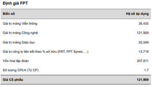 Dựa trên phương pháp định giá từng phần các mảng kinh doanh lớn của tập đoàn (Công nghệ, Viễn thông, Giáo dục), VCBS khuyến nghị mua FPT với giá mục tiêu 121,910 đồng/cp.