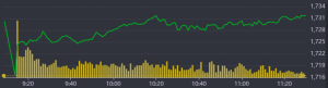 Lực cầu nâng giá có tín hiệu tích cực hơn trong sáng nay dù dòng tiền vào nhóm blue-chips sụt giảm khá nhiều. VHM bùng nổ mạnh phiên thứ 3 liên tiếp kéo VN-Index vượt luôn mốc 1730 điểm, bỏ rơi những nhà đầu tư còn đang loay hoay trong nghi ngờ.