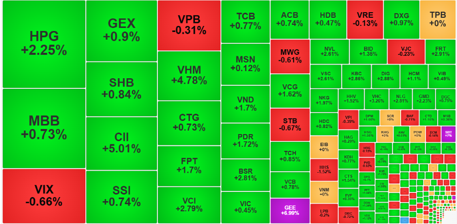 Chỉ số kết phiên sáng với mức tăng 15,26 điểm tương đương 0,89%. Chỉ riêng VHM tăng 4,78% đã đem về hơn 3,3 điểm. Trong 3 phiên lên giá mạnh liên tục, VHM đã tăng 16,7%. Điểm số còn được hỗ trợ từ BID tăng 1,35%, HPG tăng 2,25%, FPT tăng 1,7%. Đây đều là các cổ phiếu thuộc Top 10 vốn hóa sàn HoSE.