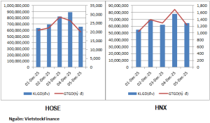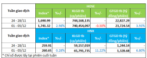 Thị trường chứng khoán diễn biến tích cực về điểm số trong tuần giao dịch mở đầu tháng 12 (từ 01 – 05/12). VN-Index tăng gần 3% lên 1,741.3 điểm. HNX-Index tăng nhẹ 0.3% lên 260.65 điểm. Thanh khoản tuần qua có sự cải thiện ở hai sàn. Trong đó, sàn HNX thể hiện sự tích cực về cả khối lượng và giá trị giao dịch.