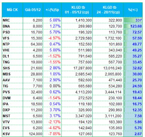 Ở sàn HNX, NRC nổi bật cùng mức tăng gần 340%, đạt 1.4 triệu đơn vị/phiên. BNA cũng đạt mức tăng hơn 100% lên 270 ngàn đơn vị/phiên.