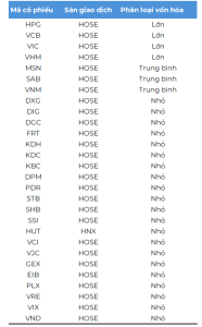 Danh sách này bao gồm các doanh nghiệp lớn như Hòa Phát (HPG), Vietcombank (VCB), Vingroup (VIC) và Vinhomes (VHM) trong nhóm vốn hóa lớn; Masan Group (MSN), Sabeco (SAB), và Vinamilk (VNM) trong nhóm vốn hóa trung bình; cùng 20 doanh nghiệp khác thuộc nhóm vốn hóa nhỏ.