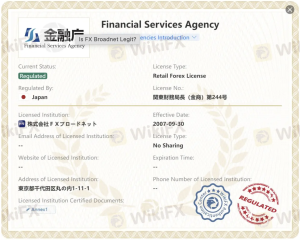 FX Broadnet được Cơ quan Dịch vụ Tài chính Nhật Bản (FSA) cấp phép và quản lý với số giấy phép 関東財務局長(金商)第244号. Đây là minh chứng rõ ràng cho tính minh bạch, độ tin cậy và mức độ an toàn cao mà công ty mang lại, vượt trội so với nhiều nhà môi giới khác trên thị trường.