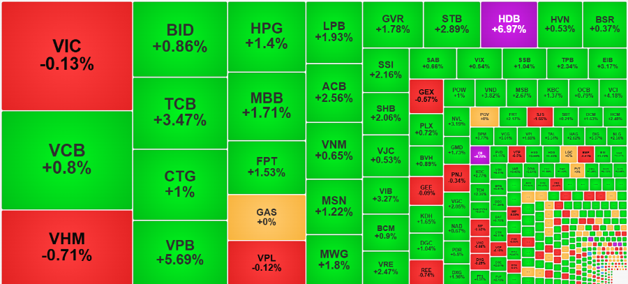 Nhóm ngân hàng là tâm điểm của phiên, khi toàn bộ cổ phiếu trong rổ VN30 đều đảo chiều tích cực so với giá buổi sáng. HDB bật kịch trần, phục hồi tới 6,97% với thanh khoản cao nhất trong 12 phiên. VPB tăng 6,4%, TCB cộng thêm 4,16%, trong khi CTG và BID cũng chuyển từ giảm sang tăng. Các mã lớn khác như VCB, STB hay VIB đều ghi nhận diễn biến tương tự. Nhờ đó, cổ phiếu ngân hàng chiếm 7/10 vị trí dẫn dắt chỉ số hôm nay.