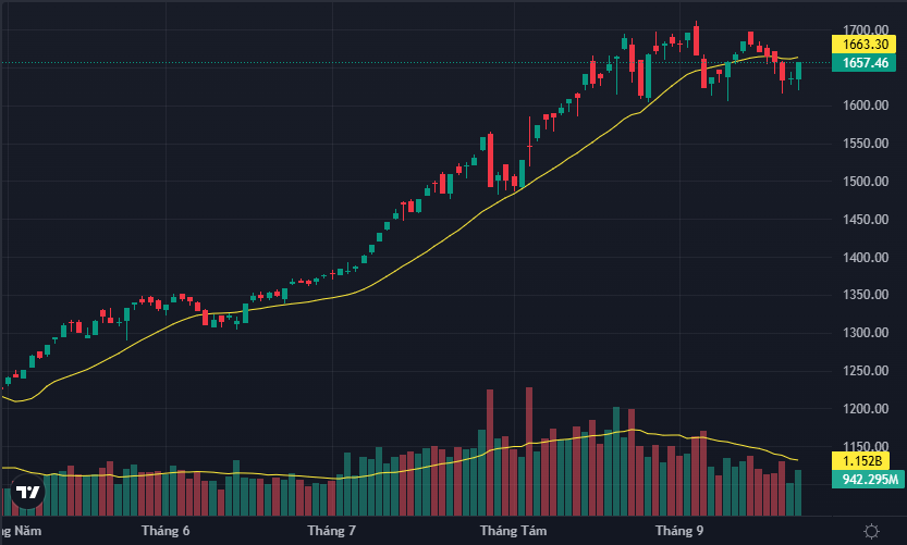 Ban đầu, VN-Index giảm sâu 14,1 điểm (-0,86%) trong phiên sáng. Tuy nhiên sang phiên chiều, lực cầu gia tăng mạnh mẽ, giúp chỉ số bật tăng 22,2 điểm (+1,36%) khi đóng cửa. Độ rộng thị trường cũng cải thiện rõ rệt với 231 mã tăng và 88 mã giảm, trái ngược hoàn toàn so với tình trạng áp đảo sắc đỏ ở buổi sáng. Thanh khoản khớp lệnh trên HoSE buổi chiều tăng tới gần 50%, phản ánh dòng tiền mua vào mạnh mẽ.