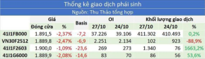 Phiên giao dịch đầu tuần, phái sinh tiếp diễn một phiên giao dịch giằng co dữ dội với phần thắng nghiêng về phe bán (short), chốt phiên phái sinh giảm 45,9 điểm về 1.891,5 điểm. Các nhịp biến động trong phiên với biên độ rộng mang lại cơ hội tìm kiếm lợi nhuận khi trading khiến thanh khoản tiếp tục sôi động với hơn 400 nghìn hợp đồng.