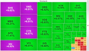 SSI, SHS, VND, VIX, VCI đồng loạt bật tăng trần. Đồng thời, nhóm ngân hàng cũng tích cực với sắc xanh trên diện rộng. Ở bất động sản, CEO, KDH, DXG, PDR, DIG gia nhập nhóm tăng, cùng với cổ phiếu họ Vingroup đóng góp tích cực cho chỉ số.