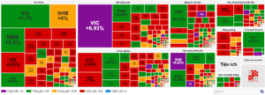 Sắc xanh bao phủ ở phần lớn các nhóm ngành mặc cho diễn biến phân hóa khá mạnh đang diễn ra. Trong đó một số mã cổ phiếu đầu ngành bất động sản, tài chính và nguyên vật liệu tăng tích cực từ đầu phiên như VIC tăng 5.88%, SSI tăng 2.21% và HPG tăng 0.19%… đóng vai trò nâng đỡ chỉ số chung.