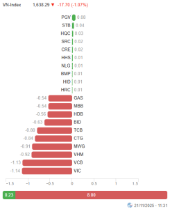 Áp lực bán gia tăng khiến các chỉ số chính tiếp tục chìm trong sắc đỏ vào cuối phiên sáng. Tạm nghỉ giữa phiên, VN-Index giảm gần 18 điểm (-1.07%), về mức 1,638.29 điểm; tương tự, HNX-Index cũng lùi về 261.39 điểm, giảm 1.07%. Độ rộng thị trường nghiêng hẳn về phía phe bán với 471 mã giảm và 197 mã tăng.