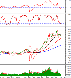 Trong phiên giao dịch sáng ngày 07/11/2025, HNX-Index tiếp tục đi xuống và khó vượt đường Middle của Bollinger Bands trong ngắn hạn.