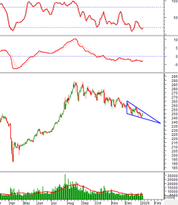 Trong phiên giao dịch sáng ngày 08/01/2026, HNX-Index tiếp tục tăng nhẹ và đang trong quá trình hình thành mẫu hình Falling Wedge.