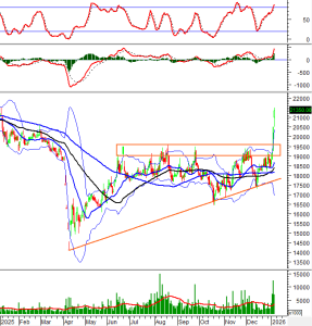 Hiện tại, VCB tiếp tục tăng và dải Bollinger Bands vẫn đang mở rộng trong khi chỉ báo Stochastic Oscillator tiếp tục tăng sau khi cho tín hiệu mua. Nếu tín hiệu tích cực này tiếp tục duy trì thì xu hướng phục hồi sẽ bền vững hơn.