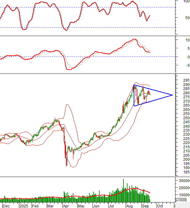 Chỉ số nhận được sự hỗ trợ từ đường Middle của Bollinger Bands trong bối cảnh mẫu hình Triangle đang hình thành.