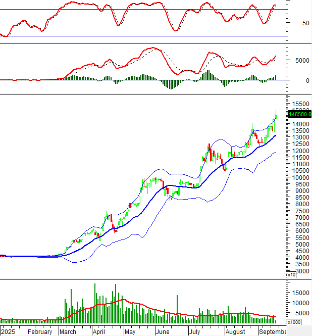 Hiện tại, DHC vẫn đang bám sát dải trên (Upper Band) của Bollinger Bands trong bối cảnh chỉ báo MACD liên tục tạo đỉnh và đáy mới cao hơn (Higher High, Higher Low). Điều này cho thấy xu hướng tăng trung hạn vẫn đang hiện hữu.
