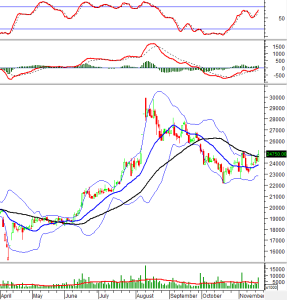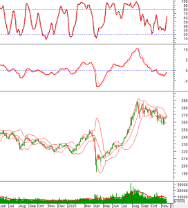 Khối lượng giao dịch nằm dưới trung bình 20 ngày từ 05/11/2025 đến nay nên chỉ số sẽ khó có đột biến. Đường Middle của Bollinger Bands đang đóng vai trò hỗ trợ ngắn hạn.