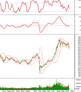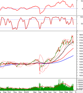 Trong phiên giao dịch sáng ngày 22/10/2025, HNX-Index tiếp tục bám vào Lower Band của Bollinger Bands.