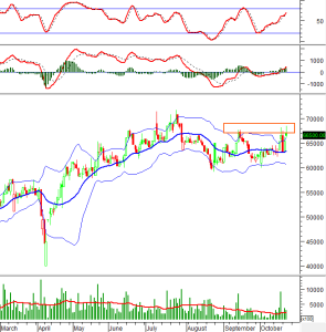 Trong phiên giao dịch sáng ngày 22/10/2025, giá cổ phiếu NTP tiếp tục bật tăng và đang kiểm tra lại đỉnh cũ tháng 09/2025 (tương đương vùng 67,000-69,000) kèm theo khối lượng giao dịch vượt mức trung bình 20 phiên cho thấy tâm lý nhà đầu tư khá lạc quan.