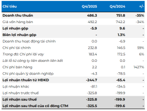 Lũy kế cả năm 2025, Công ty ghi nhận doanh thu thuần 2.1 ngàn tỷ đồng, giảm 6% so với năm trước. Trong khi đó, lỗ ròng lên gần 840 tỷ đồng, đánh dấu 4 năm lỗ nặng liên tiếp.