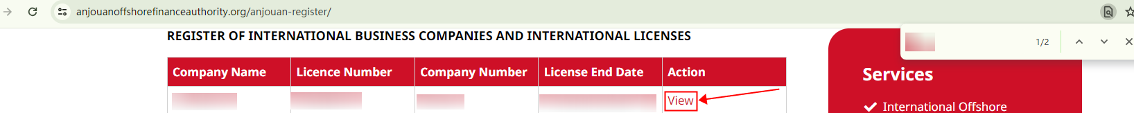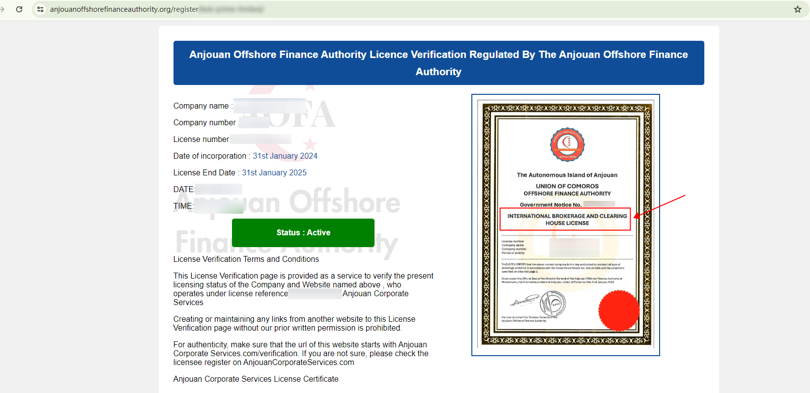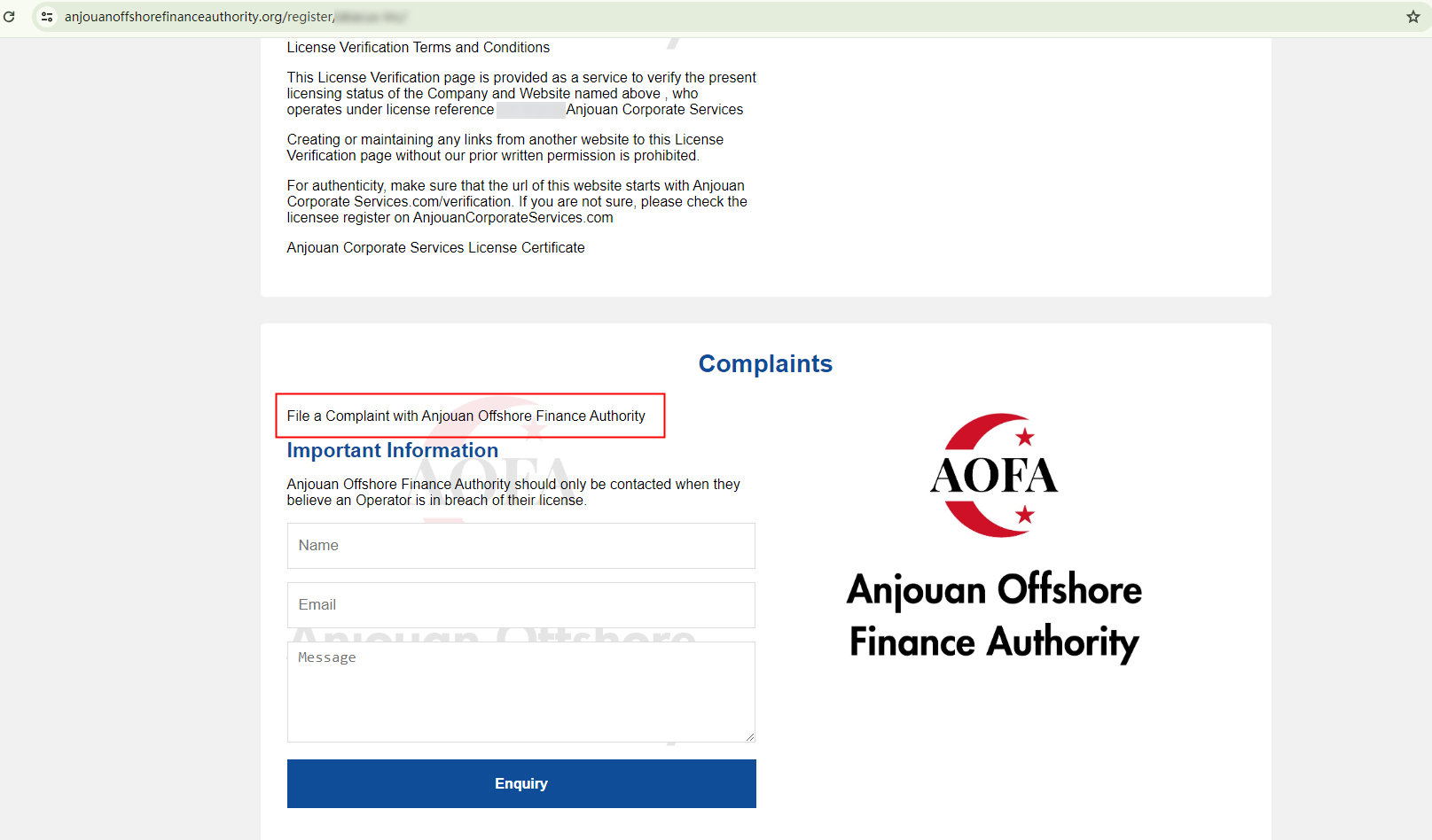 Nhà đầu tư có thể xác minh giấy phép qua trang đăng ký chính thức của AOFA: https://anjouanoffshorefinanceauthority.org/anjouan-register/