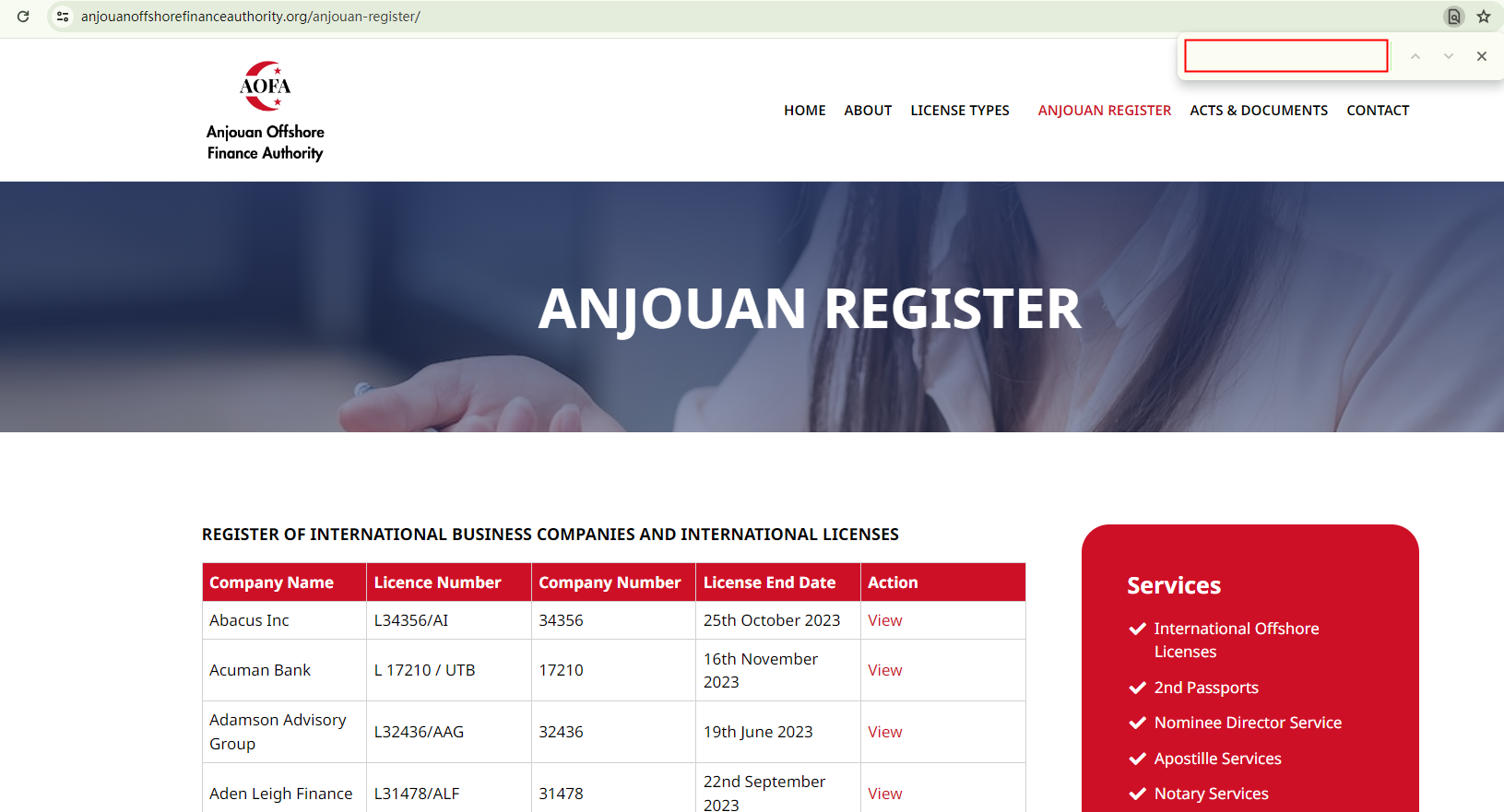 - Website: https://anjouanoffshorefinanceauthority.org/