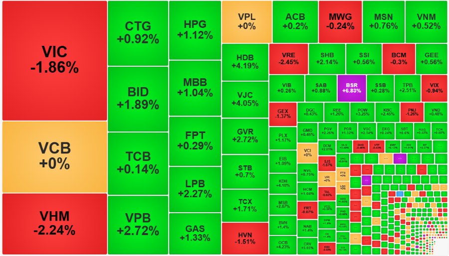 VN-Index chốt phiên sáng tăng yếu 0,53% tương đương +8,99 điểm. Chỉ số bị kiềm chế rõ ràng từ các trụ: VIC giảm 1,86%, VHM giảm 2,24%. Ngoài ra thêm VRE giảm 2,45% và VCB chỉ tham chiếu. Riêng 3 cổ phiếu nhóm Vin đã khiến VN-Index “hụt mất” 4,5 điểm.