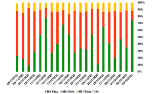 Kết thúc phiên giao dịch ngày 03/12/2025, toàn thị trường có 203 mã tăng, 38 mã giảm và 33 mã tham chiếu.