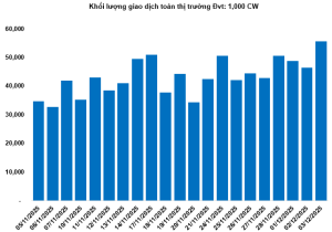 Khối lượng giao dịch toàn thị trường trong phiên 03/12 đạt 55.57 triệu CW, tăng 19.59%; giá trị giao dịch đạt 115.92 tỷ đồng, tăng 45.94% so với phiên 02/12. Trong đó, CMSN2521 là mã dẫn đầu thị trường về khối lượng với 2.85 triệu CW; CMWG2510 dẫn đầu về giá trị giao dịch với 7.72 tỷ đồng.