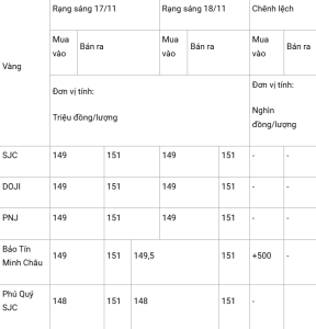 Giá vàng miếng trong nước cập nhật sáng 18/11 như sau: