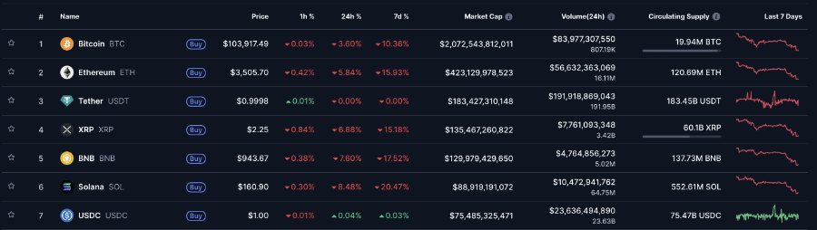 Bitcoin giảm khoảng 3,6%, giao dịch quanh ngưỡng dưới 104.000 USD, đánh dấu mức thấp nhất kể từ đầu tháng 10. Các đồng tiền khác chịu tổn thất nặng nề hơn: Ethereum mất 5,9% còn khoảng 3.500 USD – mức thấp nhất trong gần ba tháng; XRP giảm 6,92% xuống 2,26 USD; trong khi BNB, Solana và DOGE đồng loạt giảm mạnh từ 6 – 8%.