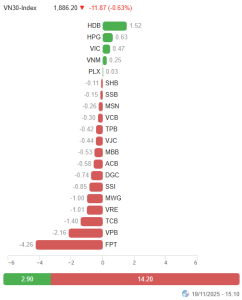– VN30-Index giảm 11.87 điểm (-0.63%), xuống còn 1,886.2 điểm. Phe bán chiếm thế áp đảo với 23 mã giảm, 5 mã tăng và 2 mã đứng giá. Trong đó, TPB, SSI, VPB, BCM, VRE và DGC đều ghi nhận mức điều chỉnh trên 2%. Ngược lại, HDB là điểm sáng đáng chú ý duy nhất với mức tăng 2.8%, còn các mã HPG, PLX, VNM và VIC chỉ giữ được sắc xanh nhẹ.