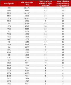 Dựa trên các tiêu chí đưa vào chỉ số của FTSE Russell (bao gồm giới hạn sở hữu nước ngoài tối thiểu, quy mô, thanh khoản và tỷ lệ tự do chuyển nhượng, và các yếu tố tương tự), VinaCapital đưa ra danh sách tiềm năng 30 cổ phiếu được dự kiến đưa vào chỉ số: